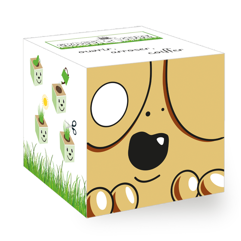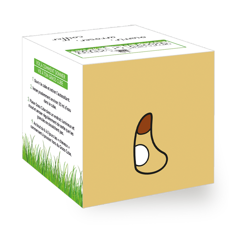 Grass Cube contient des granulés de fibres de noix de coco, des granulés d'argile, un gobelet de culture biodégradable et des semences de plantes