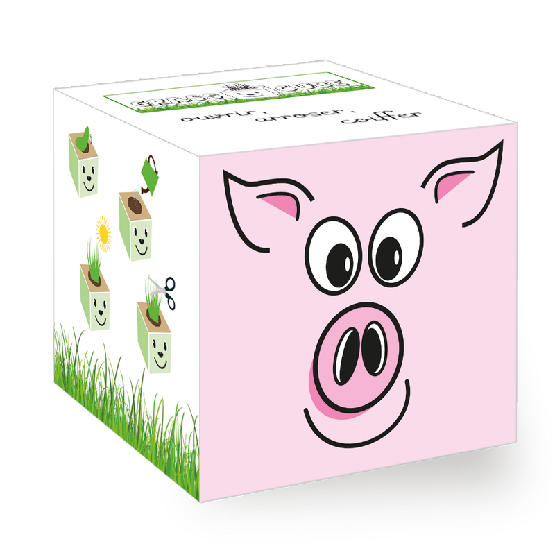Grass Cube contient des granulés de fibres de noix de coco, des granulés d'argile, un gobelet de culture biodégradable et des semences de plantes