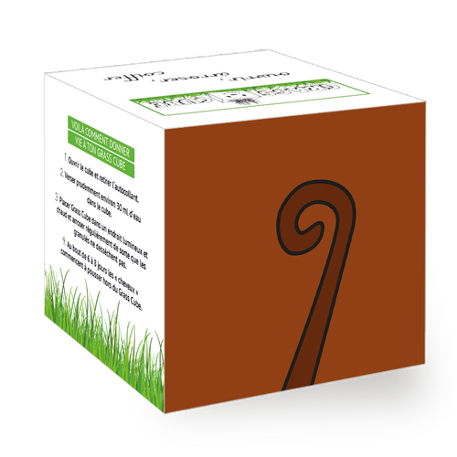 Grass Cube contient des granulés de fibres de noix de coco, des granulés d'argile, un gobelet de culture biodégradable et des semences de plantes