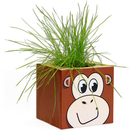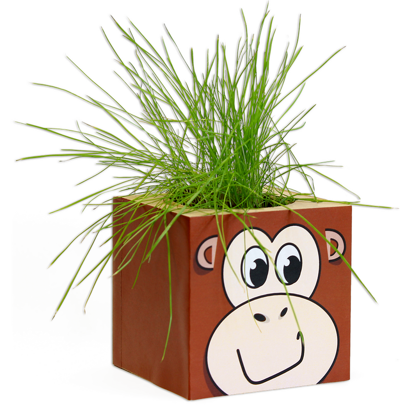 • Après deux semaines tu peux couper les « cheveux » de ton Grass Cube pour la première fois. Les brins deviendront encore plus épais et on peut les coiffer à sa guise.