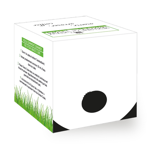 Grass Cube contient des granulés de fibres de noix de coco, des granulés d'argile, un gobelet de culture biodégradable et des semences de plantes