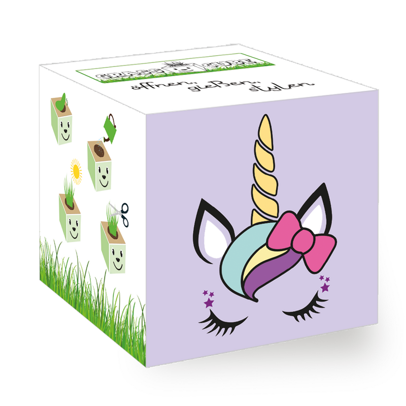 Grass Cube enthält Kokosfasergranulat, Tongranulat, kompostierbaren Anzuchttopf und Pflanzensamen.