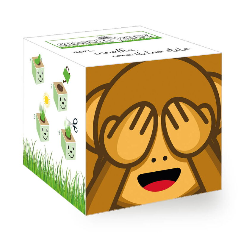Grass Cube contiene granulato di fibra di cocco, granulato di argilla, vasetto compostabile e i semi.