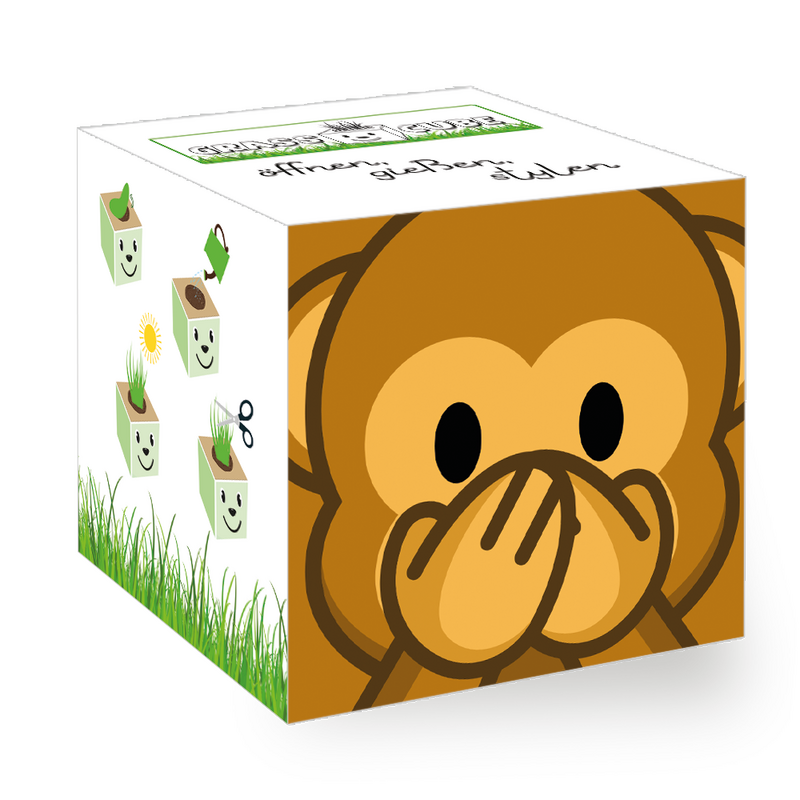 Grass Cube enthält Kokosfasergranulat, Tongranulat, kompostierbaren Anzuchttopf und Pflanzensamen.