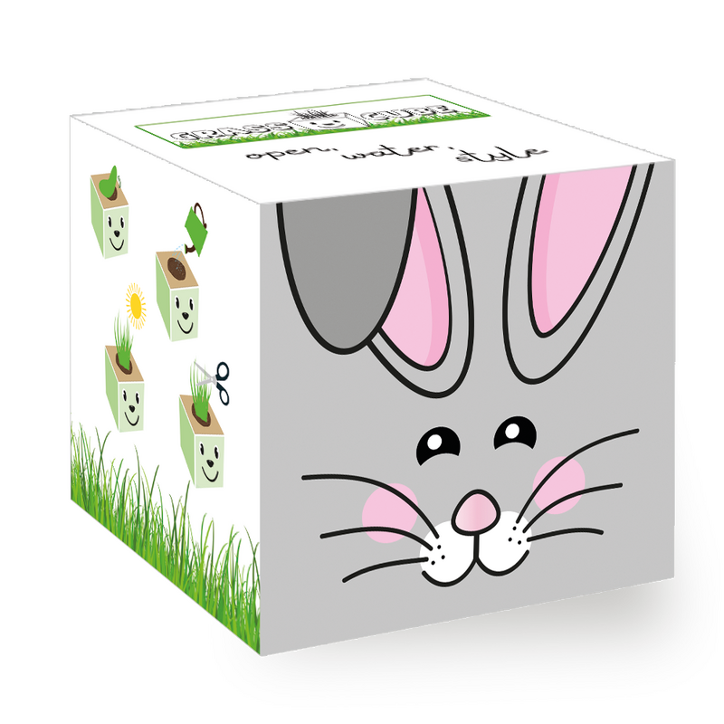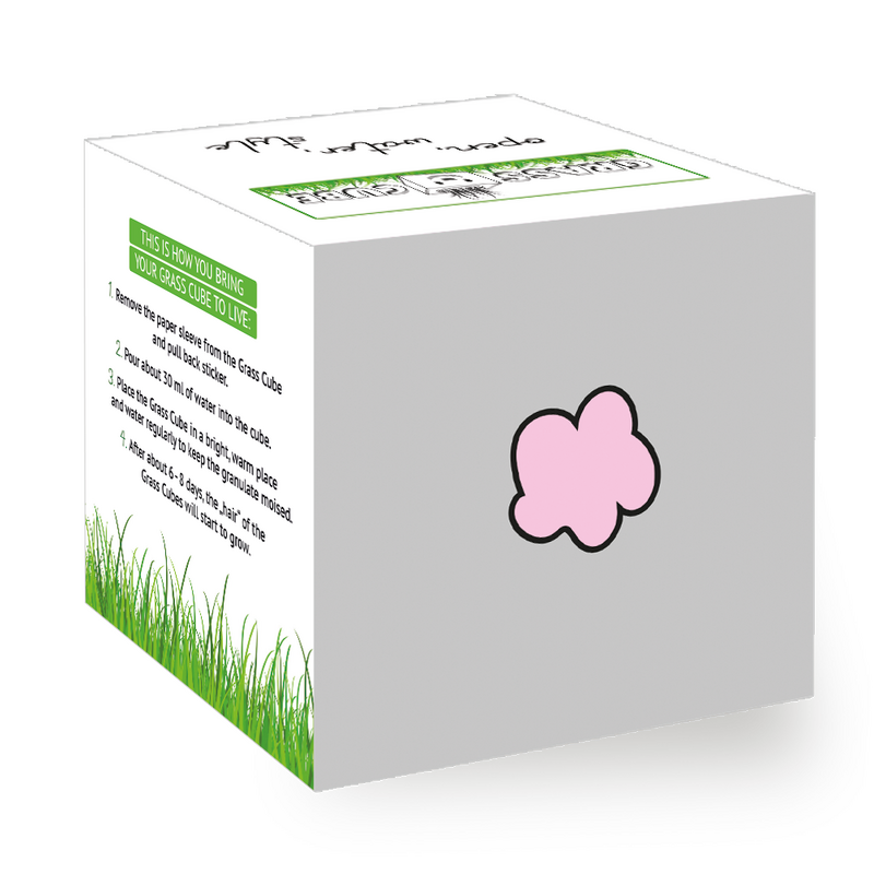 Grass Cube contains coconut fiber granulate, clay granulate, compostable planting cup and plant seeds.