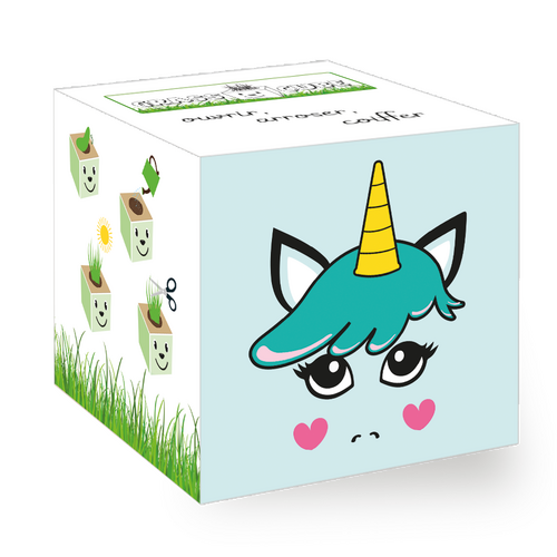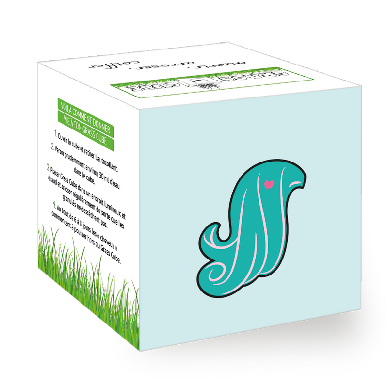 • Après deux semaines tu peux couper les « cheveux » de ton Grass Cube pour la première fois. Les brins deviendront encore plus épais et on peut les coiffer à sa guise.
