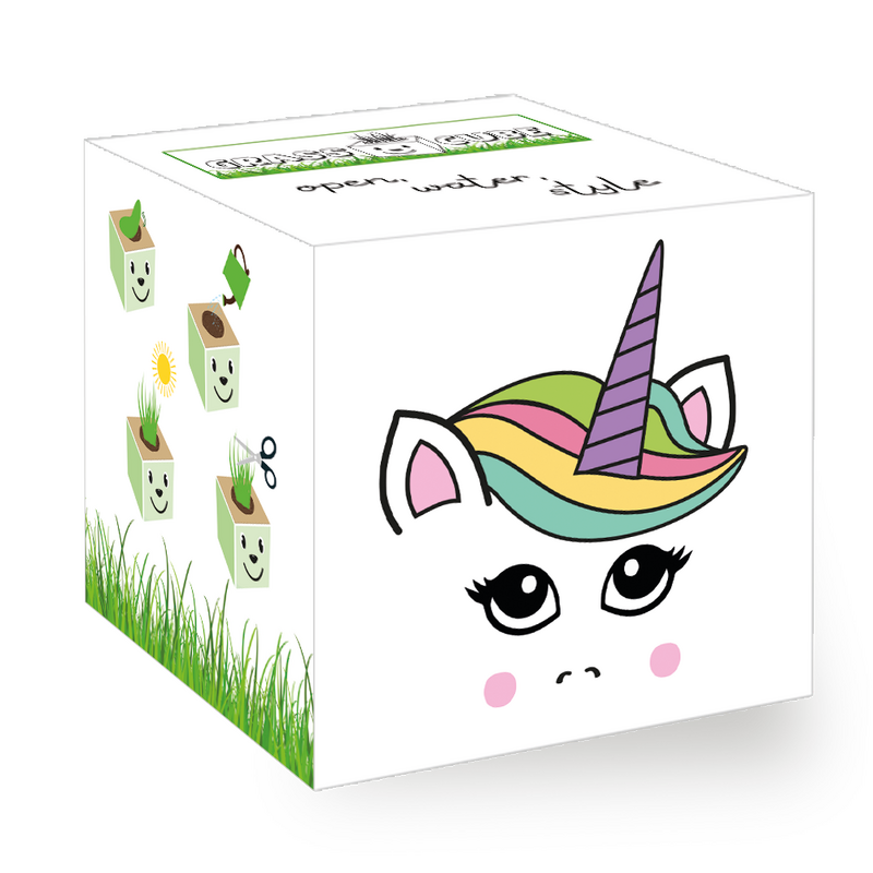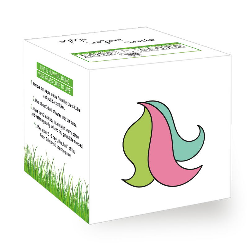 • After about 6-8 days, the "hair" of the Grass Cube will start to grow. Continue to water moderately. After about 14 days, you can give your Grass Cube its first haircut. The grass blades will grow back even more densely and can be "styled" as desired.