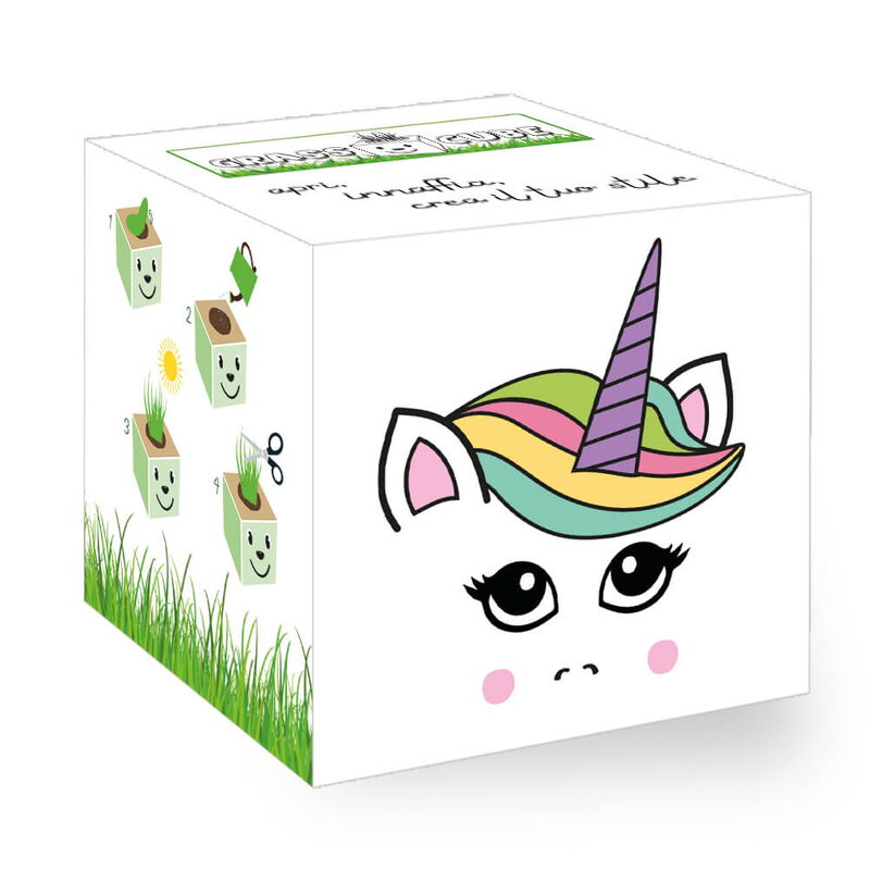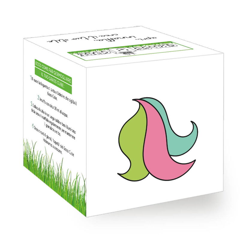 Grass Cube contiene granulato di fibra di cocco, granulato di argilla, vasetto compostabile e i semi.