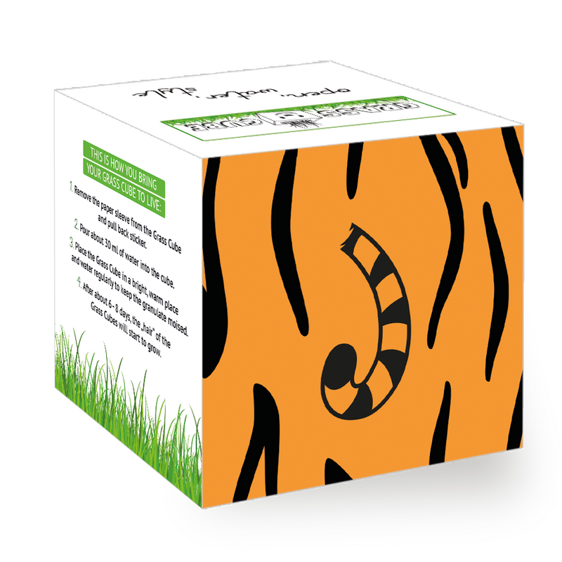 • After about 6-8 days, the "hair" of the Grass Cube will start to grow. Continue to water moderately. After about 14 days, you can give your Grass Cube its first haircut. The grass blades will grow back even more densely and can be "styled" as desired.
