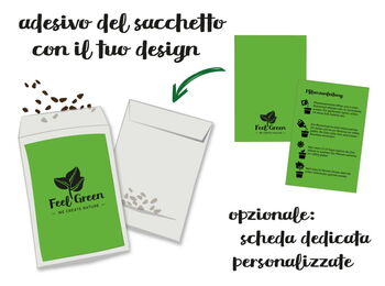 I sacchetti di semi geenpack sono disponibili in 3 differenti dimensioni e possono essere personalizzati con la tua grafica anche a partire da ordini di piccole quantità.