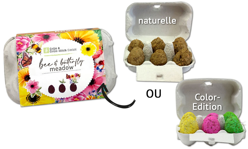 Nos seedeggs fabriqués manuellement avec grand soin ont à peu près la taille d'un œuf de caille. Par beau temps, il est possible de sécher les seedeggs à l'extérieur au soleil. Pour la fabrication de nos boules de semences nous utilisons exclusivement à 100% des matières naturelles. Le mélange de semences de fleurs à l'intérieur tout comme une grande partie des composants sont mêmes certifiés biologiques. Les seedeggs réalisés à la main transforment des surfaces vertes dénudées, des pots de fleurs ou des parterres de fleurs en des prés de fleurs multicolores et en un petit paradis nutritif pour les abeilles, les papillons et beaucoup d'autres insectes utiles.