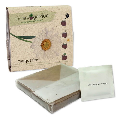 L'instant garden contient une pastille de fibres de noix de coco, un sachet de culture, un sachet de semences de plantes.