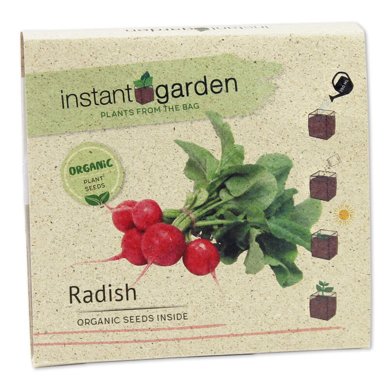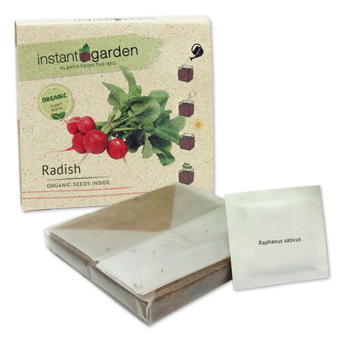 instant garden contains plant bag, seed bag with certified organic plant seeds and a coconut fiber tab.