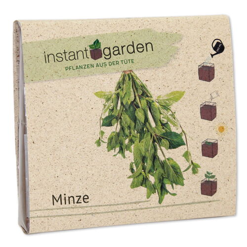 instant garden enthält eine Kokosfasertablette, eine Anzuchttüte und eine Pflanzensamentüte mit biozertifizierten Pflanzensamen.