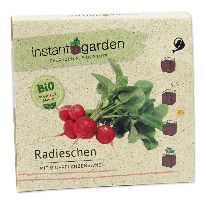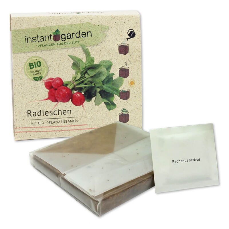 instant garden enthält eine Kokosfasertablette, eine Anzuchttüte und eine Pflanzensamentüte mit biozertifizierten Pflanzensamen.