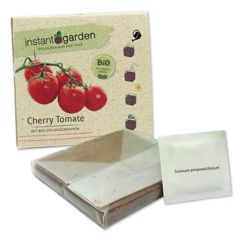 instant garden enthält eine Kokosfasertablette, eine Anzuchttüte und eine Pflanzensamentüte mit biozertifizierten Pflanzensamen.