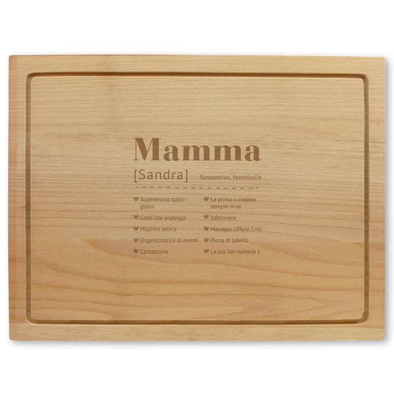 Cosa significa mamma? Una mamma è la supereroina di tutti i giorni, specializzata nel risolvere qualsiasi tipo di crisi e nell'organizzare gli eventi più memorabili. Sempre al tuo fianco, è la tua prima sostenitrice, si prende cura di te da sempre e per sempre, la tua migliore amica e la miglior narratrice di storie. La tua mamma è un tesoro dai mille talenti! Personalizza il tagliere con il nome della tua mamma inciso con il laser. Mentre prepara deliziosi manicaretti, le ricorderà quanto è meravigliosa!
