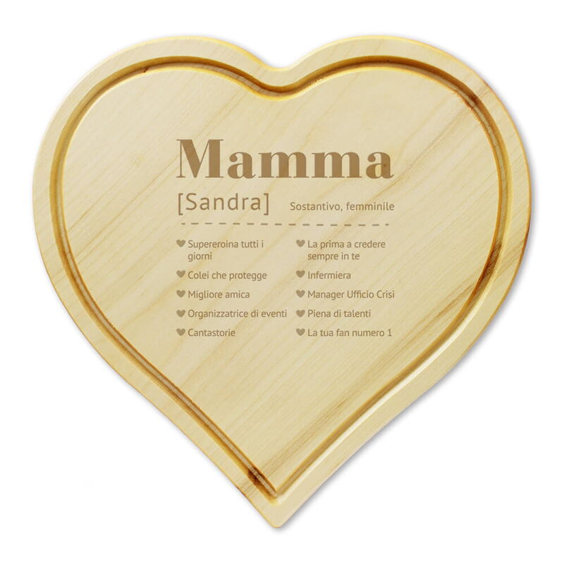 Cosa significa mamma? Una mamma è la supereroina di tutti i giorni, specializzata nel risolvere qualsiasi tipo di crisi e nell'organizzare gli eventi più memorabili. Sempre al tuo fianco, è la tua prima sostenitrice, si prende cura di te da sempre e per sempre, la tua migliore amica e la miglior narratrice di storie. La tua mamma è un tesoro dai mille talenti! Personalizza il tagliere con il nome della tua mamma inciso con il laser. Mentre prepara deliziosi manicaretti, le ricorderà quanto è meravigliosa!