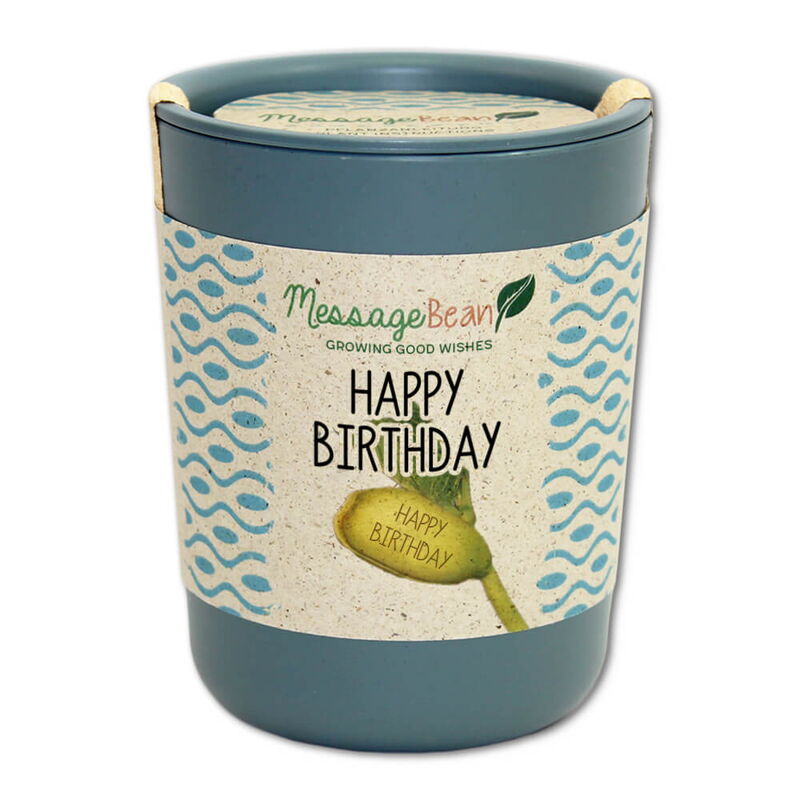 • After about 7-10 days the plant will start to grow and a bean carrying a congratulatory greeting will slowly sprout out of the container. Continue to water moderately.