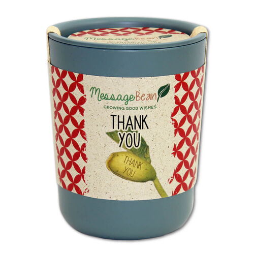 • After about 7-10 days the plant will start to grow and a bean carrying a congratulatory greeting will slowly sprout out of the container. Continue to water moderately.