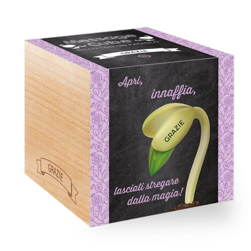 Message Cube contiene granulato di fibra di cocco, granulato di argilla, vasetto compostabile e un fagiolo magico con incisione laser.