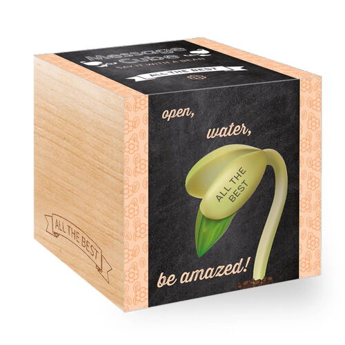 Message Cube contains coconut fiber granulate, clay granulate, compostable planting cup and a special laser engraved wonder bean.