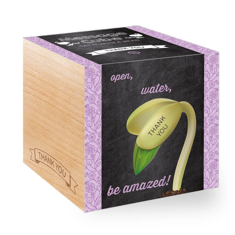 Message Cube contains coconut fiber granulate, clay granulate, compostable planting cup and a special laser engraved wonder bean.