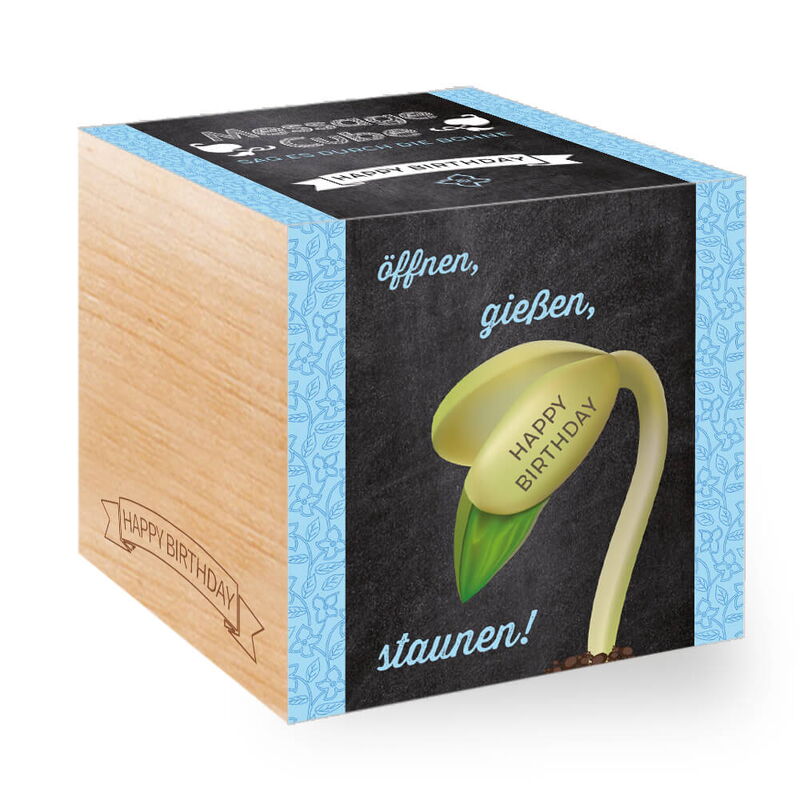 Message Cube enthält Kokosfasergranulat, Tongranulat, kompostierbaren Anzuchttopf und eine gelaserte Bohne.