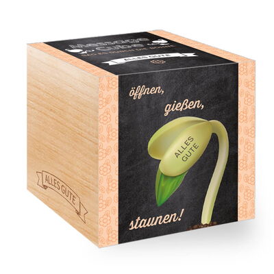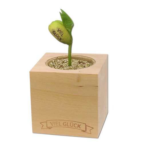 Message Cube enthält Kokosfasergranulat, Tongranulat, kompostierbaren Anzuchttopf und eine gelaserte Bohne.