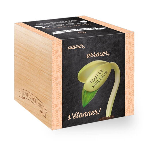 Le Message Cube contient granulés de fibres de noix de coco, granulés d'argile, un gobelet de culture biodégradable et un haricot messager.