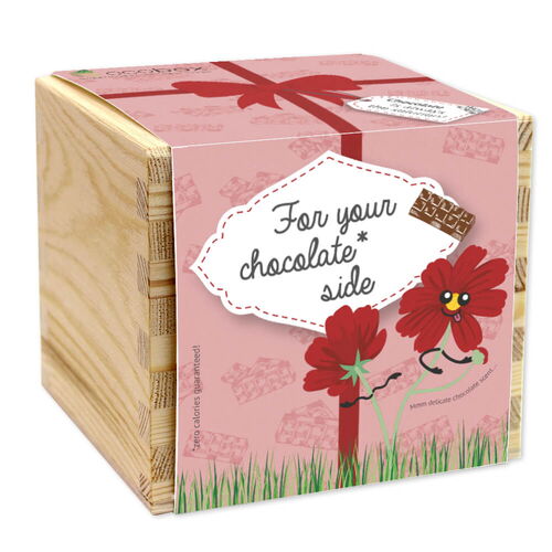 • As soon as the flowers you have grown are too big for the ecobox, the chocolate flowers can be transferred into a flower pot with some soil or outdoors using the compostable planting cup. The wooden box can then be used as a pen holder or gift box, for example!