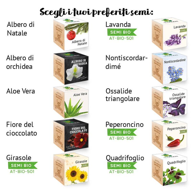 Scegli tra i seguenti semi a disposizione: albero di Natale, albero di orchidea, aloe vera, fiore del cioccolato, girasole