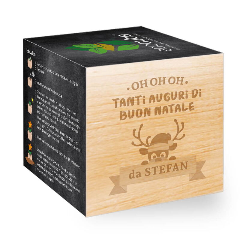 Oh oh oh! La nostra renna Rudolf porta ai tuoi cari degli speciali auguri di Natale che spuntano dal suo naso scintillante. Scegli i semi che preferisci e inserisci il tuo nome nel campo "mittente". Il nostro ecocube personalizzabile è ideale sia per contenere il tuo messaggio di auguri che come vero e proprio regalo di Natale per tutte le persone di valore nella tua vita. In pochi, semplici passaggi, questo ecocube, completamente ecologico, si trasforma in un perfetto regalo di Natale che farà breccia nel cuore delle tue persone preferite.