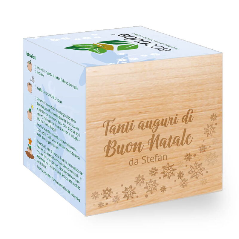 Let it snow, let it snow, let it grow! Anche se non nevica, puoi sempre spedire i tuoi auguri di Natale con questo stupendo ecocube personalizzabile! In pochi, semplici passaggi, questo kit da coltivare, completamente ecologico, si trasforma in un perfetto regalo di Natale che farà breccia nel cuore delle tue persone preferite. Il nostro ecocube personalizzabile è ideale sia per contenere il tuo messaggio di auguri che come vero e proprio regalo di Natale per tutte le persone di valore nella tua vita. In pochi, semplici passaggi, questo kit da coltivare, completamente ecologico, si trasforma in un perfetto regalo di Natale che farà breccia nel cuore delle tue persone preferite.