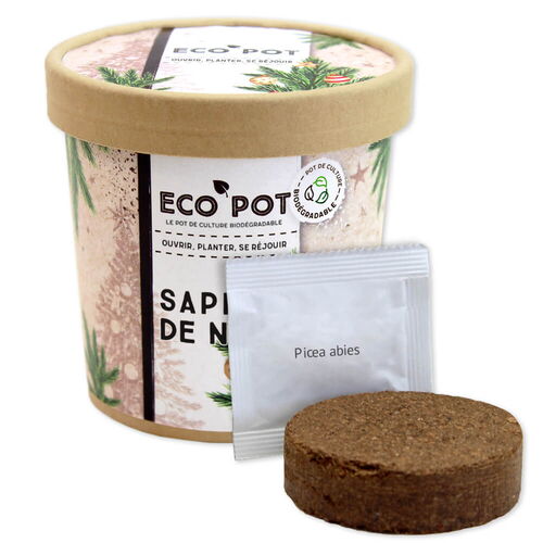 ecopot contient un pot biodégradable, des tablettes de fibres de coco et un sachet avec des semences de plantes.