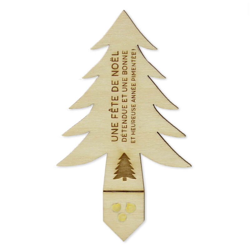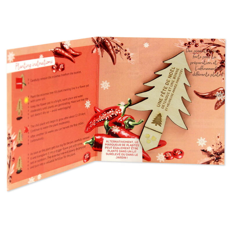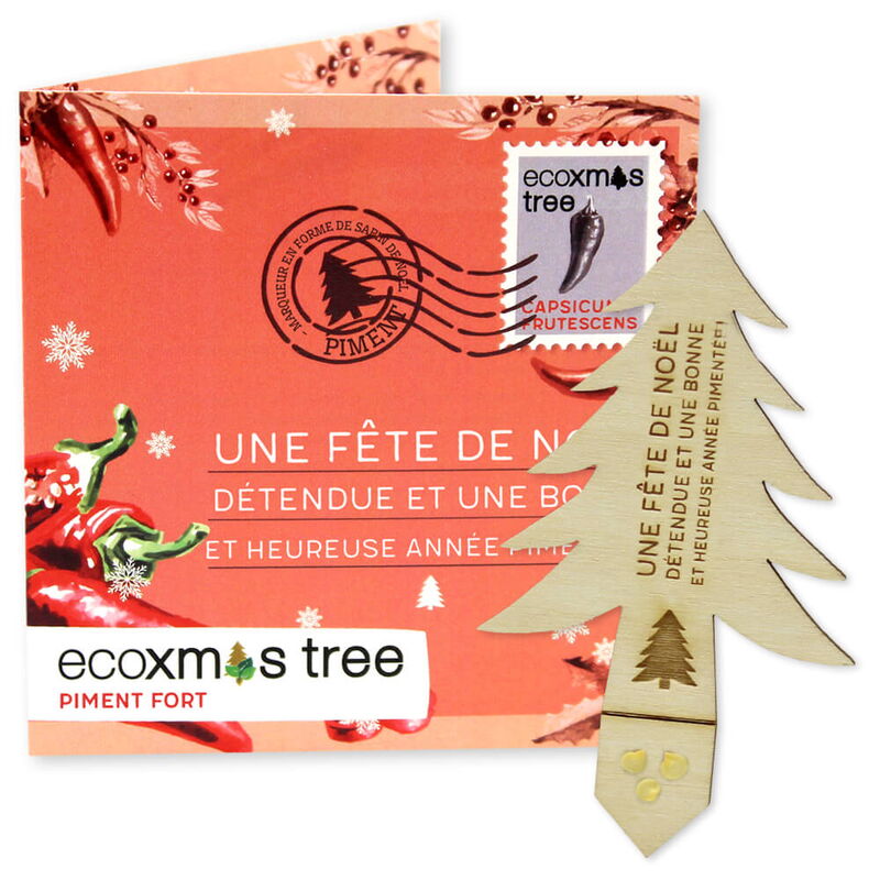 L'ecoxmas contient un marqueur de plantes en forme de sapin de Noël, de la colle écologique et des semences de plantes.