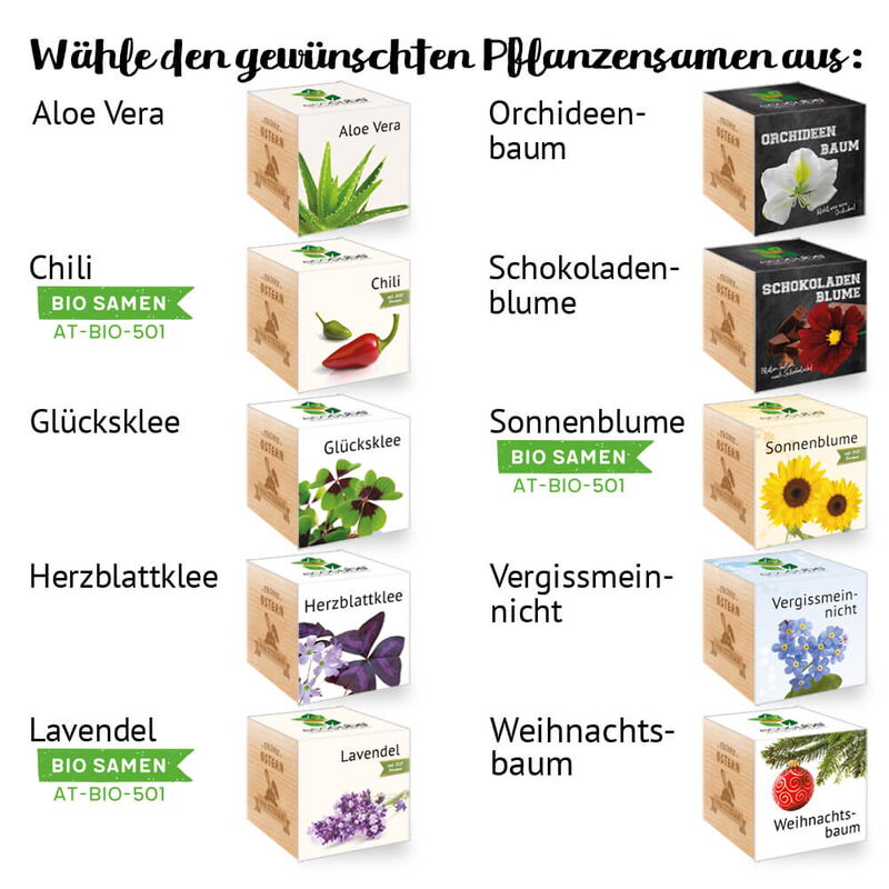 Wähle zwischen folgenden Pflanzensamen: Aloe Vera, Chili , Lavendel , Glücksklee, Herzblattklee, Orchideenbaum, Schokoladenblume, Sonnenblume , Vergissmeinnicht, Weihnachtsbaum