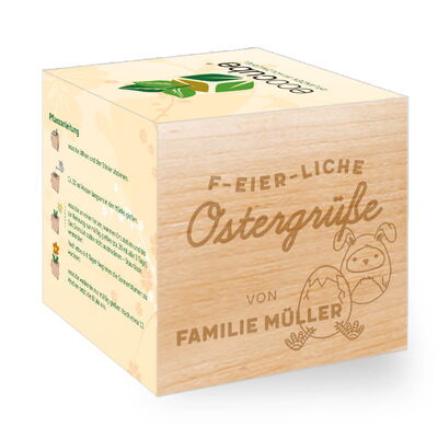 - Die linke Seite des Pflanzwürfel wird mit deiner Personalisierung graviert und macht den ecocube zu einem besonderen Andenken und originellem Geschenk.