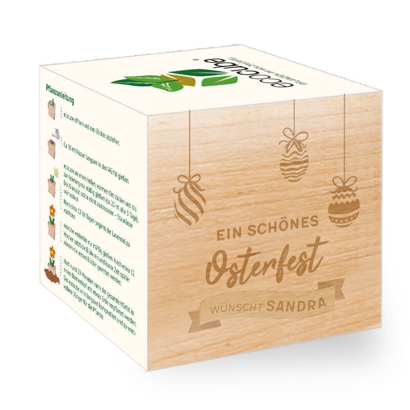 - Die linke Seite des Pflanzwürfel wird mit deiner Personalisierung graviert und macht den ecocube zu einem besonderen Andenken und originellem Geschenk.