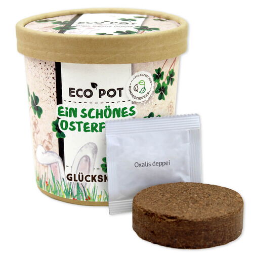 • Wird der Glücksklee zu groß für den Pot, Banderole vom Becher entfernen und den kompostierbaren ecopot in einen Blumentopf mit etwas Erde verpflanzen.