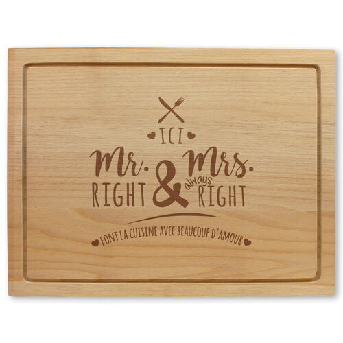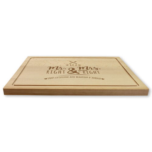 Notre planche à découper est également un cadeau de mariage particulier mais on peut l'offrir aussi à beaucoup d'autres occasions comme à la Saint-Valentin, à un anniversaire ou bien à Noël à sa meilleure moitié! Grâce à sa taille idéale on peut préparer et servir ensemble de bons repas ainsi que des collations. Les planches sont réalisées en beau bois d'hêtre et sont gravées par un traitement au laser de haute qualité. On sait que l 'amour passe par l'estomac!