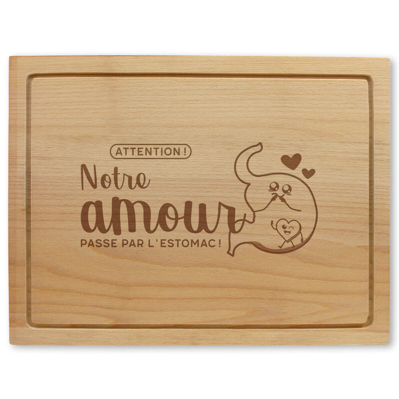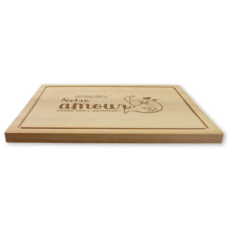 Notre planche à découper est également un cadeau de mariage particulier mais on peut l'offrir aussi à beaucoup d'autres occasions comme à la Saint-Valentin, à un anniversaire ou bien à Noël à sa meilleure moitié! Grâce à sa taille idéale on peut préparer et servir ensemble de bons repas ainsi que des collations. Les planches sont réalisées en beau bois d'hêtre et sont gravées par un traitement au laser de haute qualité. On sait que l 'amour passe par l'estomac!