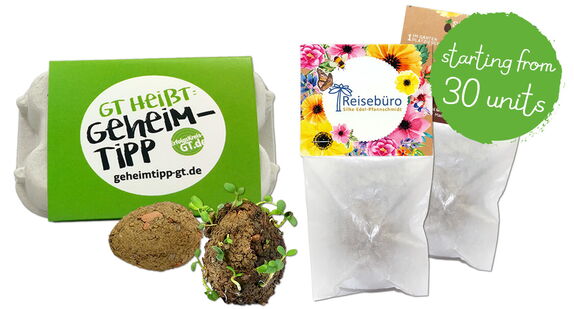 Seedeggs can be "thrown" (= planted) in the garden, in the flower bed or on an empty green space – of course depending on the current season. The natural seed balls can also be planted in a flower pot (already filled with some soil) indoors all year round. Once a suitable spot has been found, the seedeggs only need to be watered moderately or they can wait outside for the next rain.