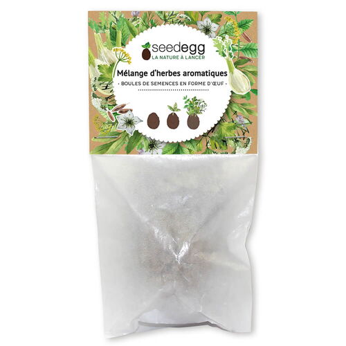 seedegg contient granulés de fibres de noix de coco, granulés d'argile, poudre d'argile et un mélange mélange d'herbes aromatiques certifiées biologiques.