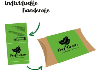 Die stilvolle Kissenschachtel aus Kraftpapier wird mit 4 seedeggs gefüllt und mit einer personalisierten Banderole umschlossen.