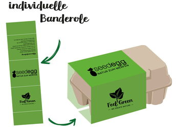 Der kleine Eierkarton beinhaltet 6 Stk. seedeggs und wird mit einer individuellen Banderole umschlossen. (Werbe-)Botschaften und Pflanzanleitung finden auf diesen Verpackungstyp genügend Platz.