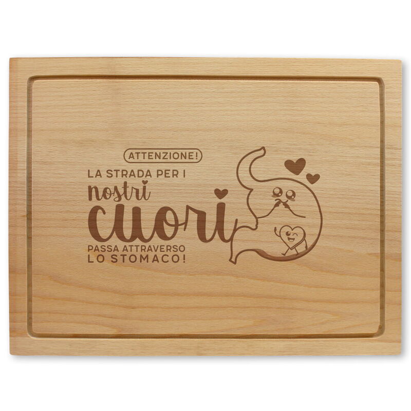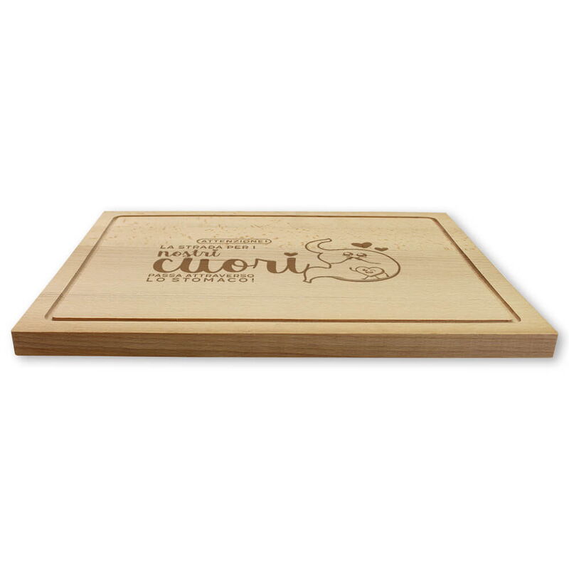 Questo tagliere è un regalo di nozze davvero speciale, ma può essere donato alla persona che si ama anche in molte altre occasioni: San Valentino, il compleanno, Natale. L'alleato perfetto in cucina, per preparare e servire i tuoi manicaretti. Ogni tagliere è realizzato in legno di faggio con incisione di alta qualità, ottenuta grazie alla tecnologia laser. Lo sanno tutti che la strada per arrivare al cuore di una persona passa attraverso il suo stomaco!