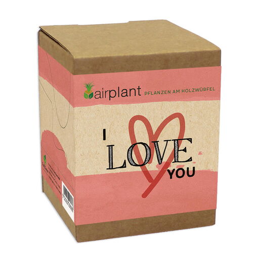 Ein airplant-Set beinhaltet eine lebende Pflanze und einen hochwertig lasergravierten Holzwürfel, auf dem die Pflanze gesteckt wird.