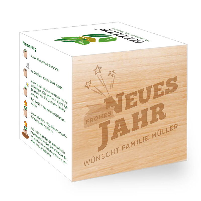 Frohes Neujahr! Schenke zum Jahreswechsel einen Glücksbringer der (wachsenden) Art. Personalisiere den ecocube nach deinen Wünschen. Hierbei können Pflanzensorte und Absender ganz einfach individualisiert werden.