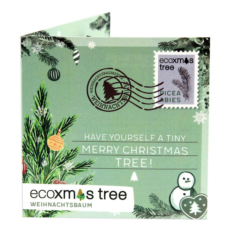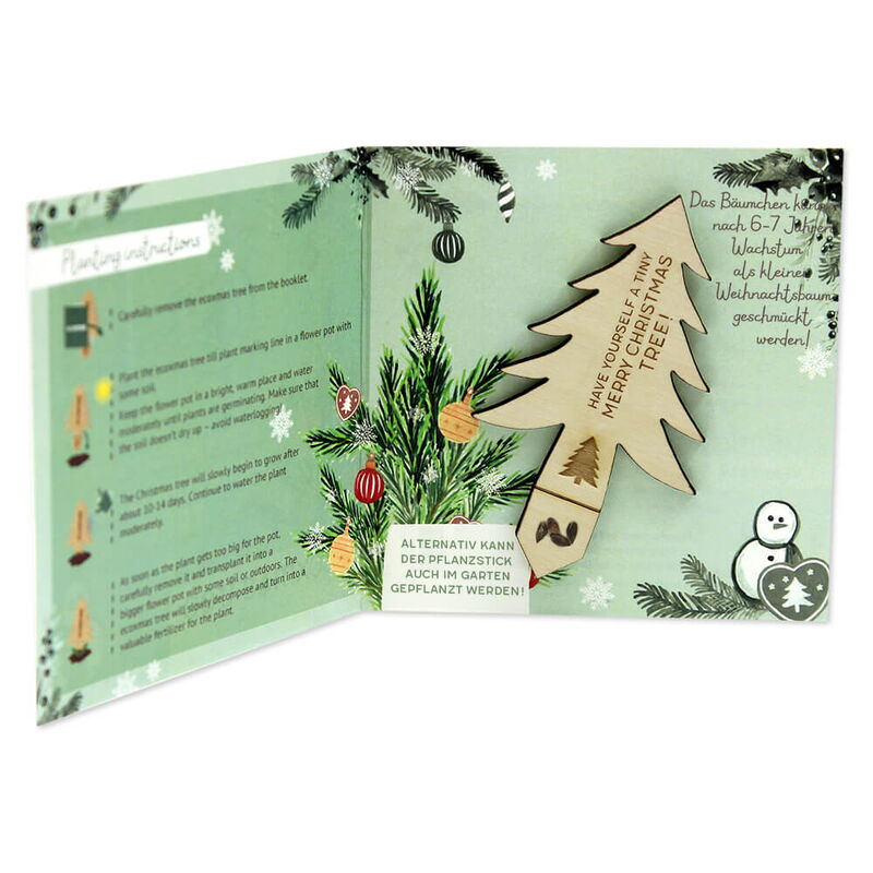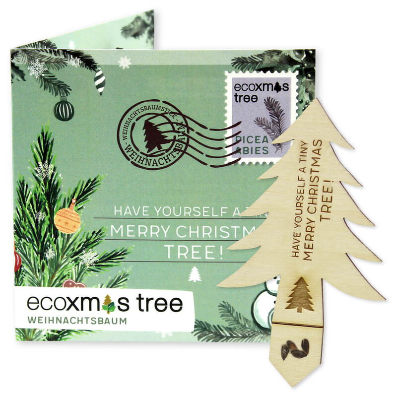 ecoxmas enthält Weihnachtsbaumstick aus Holz, Öko-Kleber und Pflanzensamen.